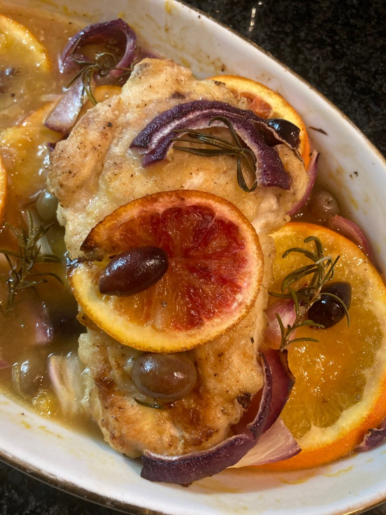 Rinse and pat dry chicken breasts. Sprinkle some salt & pepper and the garlic powder into the flour in large dish or pan. Dredge chicken breasts in flour mixture. Heat oil in skillet until shimmery. Place chicken breasts in pan and sear for about 3-4 minutes on each side. Reserve to wire rack to drain. In large baking dish squeeze juice of 1/2 large Valencia orange. Slice other half in rounds. Slice blood and or Cara Cara orange. Slice onion in thick pieces. Lay larger orange slices and half the onions on bottom of dish. Scatter half of the olives on the orange slices. Place chicken on top. On top of that lay pink/red orange slices. Scatter onions and olives around and on top of chicken. Place several rosemary sprigs around and on chicken. Cover with foil. Bake at 350*/170* for 20 minutes. Remove foil and bake an additional 10 minutes.