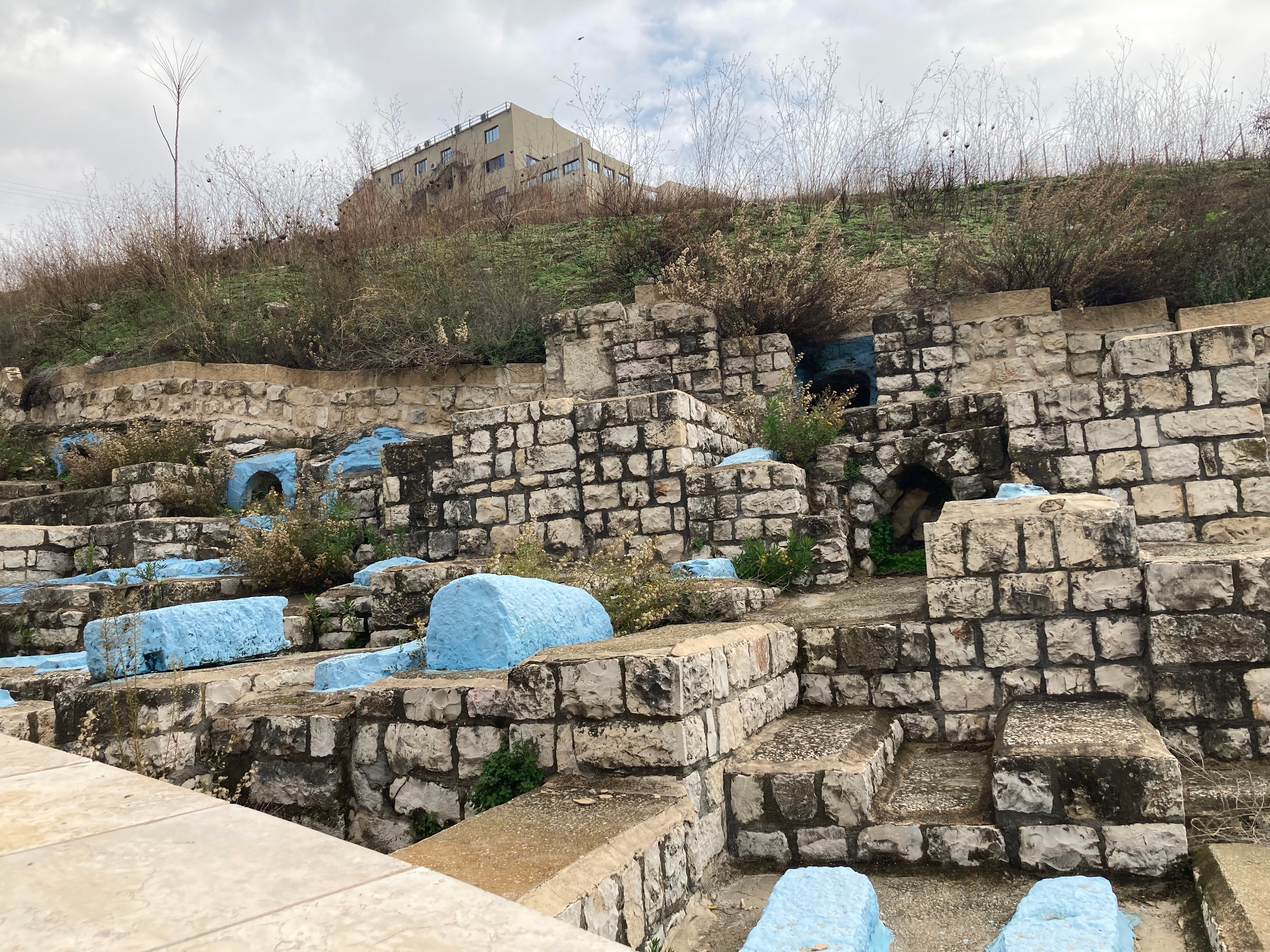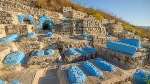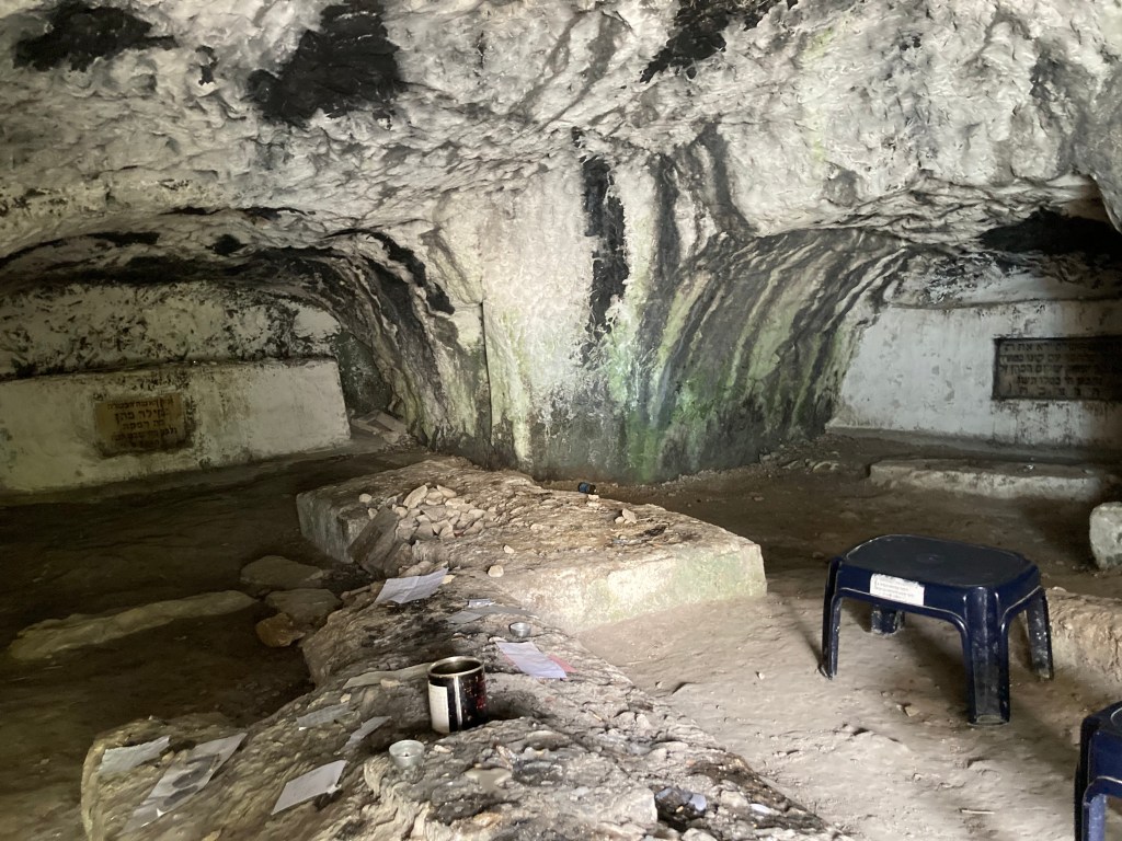 Sunday morning, we drove up to this city perched high atop a mountain. Finding the cemetery was the easy part. It’s huge, with thousands of years of history. Many, many famous rabbis, Torah scholars, and righteous people are buried here. The older, more important graves are marked in a mystical azure color, the color of the heavens. The oldest graves, from Biblical times, are at the top of the mountain and along the sides of the mountainside in deep caves channeled into the stone. There are graves on top of graves, so finding this one in particular seemed a daunting feat. Luckily, as we stopped to ask some seminary girls if they knew of the story or where the tombs were, they pointed behind us. We were standing right in front of their burial chamber!! “Never coincidences in Israel – only from G-d” is a saying here.