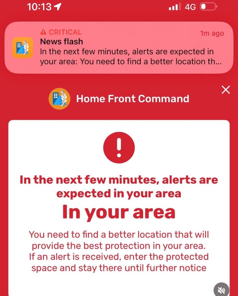 The state control of phones: every single Israeli phone line has been receiving those banshee like, horrific sounding, extremely loud signals as soon as an Iranian missile launch is detected. We get these alerts at all times of the day and night, and. Most definitely, it can be jarring/nerve unraveling. However, it is not to panic us, but to alert us that we have less than six minutes to take cover. At the minute before impact there is another signal and country-wide red alerts and sirens go off 15 seconds before impact in the surrounding area. This is to ensure that all people have a chance to get to a protected space or to stop their vehicles, exit and take shelter in a more protected area. I thank G-d and the State of Israel for coming up with this systems. It saves lives.