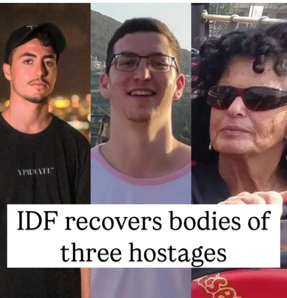 Also in the news yesterday, the IDF recovered the bodies of three murdered hostages from the tunnels in Gaza. In an overnight operation, Yonatan Samerano, 21, Staff Sgt. Shai Levenson, 19, and Ofra Kedar, 71, were brought back to Israel for identification and burial. Samerano fled from the Nova music festival with two friends. They were all murdered. His body was dragged to Gaza on te back of a pickup truck. Levenson was a tank commander stationed on the Gaza border. He was killed while battling the invading Hamas terrorists. Kedar was murdered while out on her morning walk the morning of 7October.