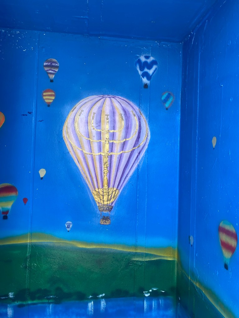 On the outer walls of the bomb shelter he painted the most gorgeous mural of the Sea of Galilee in the full bloom of springtime. The painting wraps around the entire magenit. The mountains of the Golan and lower Galil region encircle it. Butterflies ands birds symbolize new life. The red poppies are a remembrance of the hostages still in captivity. Working with a medium of spray paint, Justin captured the fishing boats on the sea and the migrating birds overhead. The morning sun over the mountains depicts the verse from Malachi 4:2. “The sun of righteousness will arise with healing in his wings.” It was truly a project of healing.