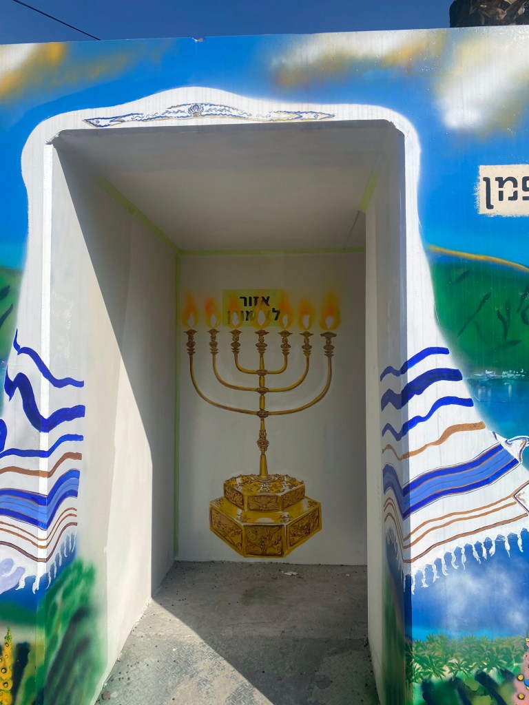 Stepping inside, instead of being greeted by cold, gray walls, Justin painted the seven-branched menorah that stands in the Old City of Jerusalem, its flames almost alive, glowing brightly. It was truly an inspired vision and a way to share the message of hope and G-do’s love and mercy to His people. It is the national symbol of Israel and has become his signature inside each bomb shelter. “The menorah is a sign of the victory of the Jews over their enemies. It is an eternal symbol that proclaims ‘I am with you always,” explained Justin.