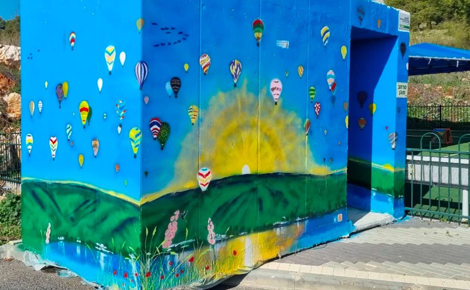After this first shelter project, 50 more quickly became available throughout the Galilee, in Tiberias and he Holy City of Tsfat. Justin has received a commission to decorate magenit at playgrounds, skate parks, bus stops and schools. Thus far, six have been completed.