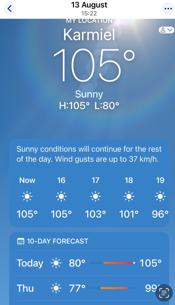 Our continued heat wave broke last night. Temporarily. It finally feels like autumn, at least for the time being. The thermometer is supposed to climb back up later this week, which is such a metaphor for life here. Despite talks of peace, rockets are still being fired from Gaza into Israel; Hamas is completely refusing to disarm; a giant U.S. military base is being built here on Israeli soil just outside the Gaza Envelope; Hizbulla will not disarm, but seems to be doubling down in its attempt to stage a Northern October 7; and Iran is planning to send over 2000 missiles in its next attack. The heat never seems to abate.