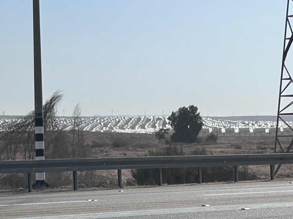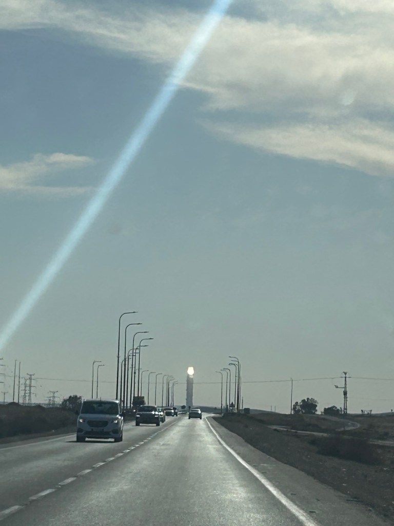 From Mitzpe Ramon, we made our way back to Beersheva. We kept seeing this bright flaming tower/beam in the distance – both coming and going. So we decided to check it out-