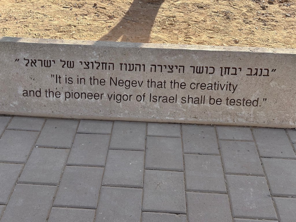 We made a big stop at Sde Boker, the kibbutz founded by first Israeli president, David Ben Gurion. Ben Gurion and his wife, Paula, lived the desert and thought it was the safe spot and key to future Israeli development. He foresaw the day when the Jewish people would learn to irrigate and farm the desert and make it bloom. He wasn’t wrong.