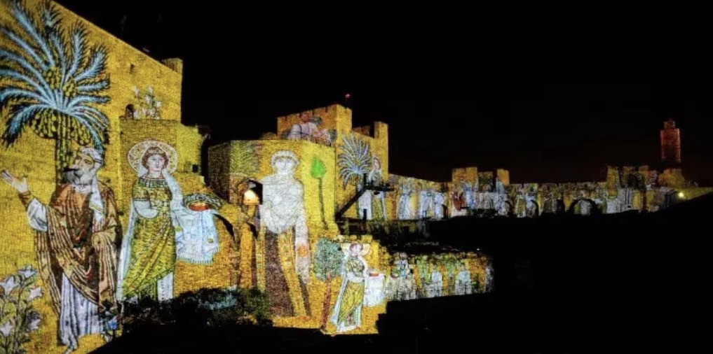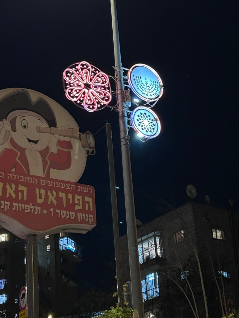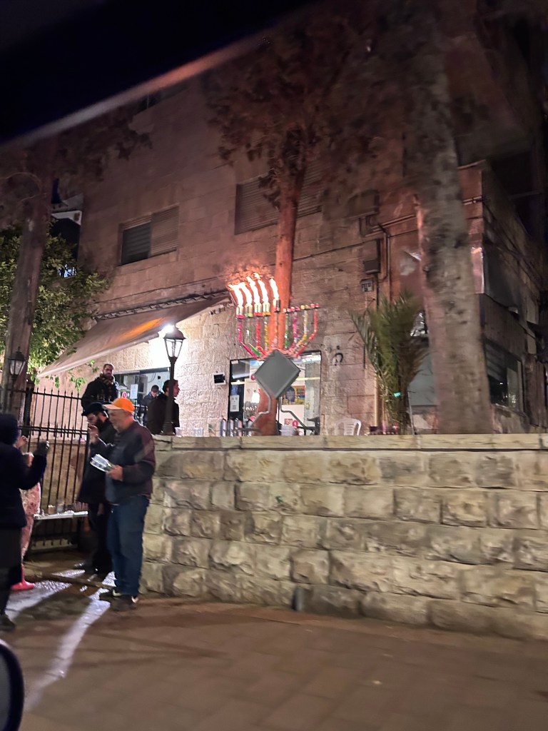 This past week, John and I decided to spend an evening in Jerusalem. I’d always wanted to see the Chanukah decorations and lights and experience streets and windows bathed by the glow of Hanukkiyahs (menorahs). The spelling always looks wrong on that one. But we did get to Jerusalem by sunset and it did not disappoint. We first drove around to see some of the decorations, and the walls of the Old City were lit up with special light projections.