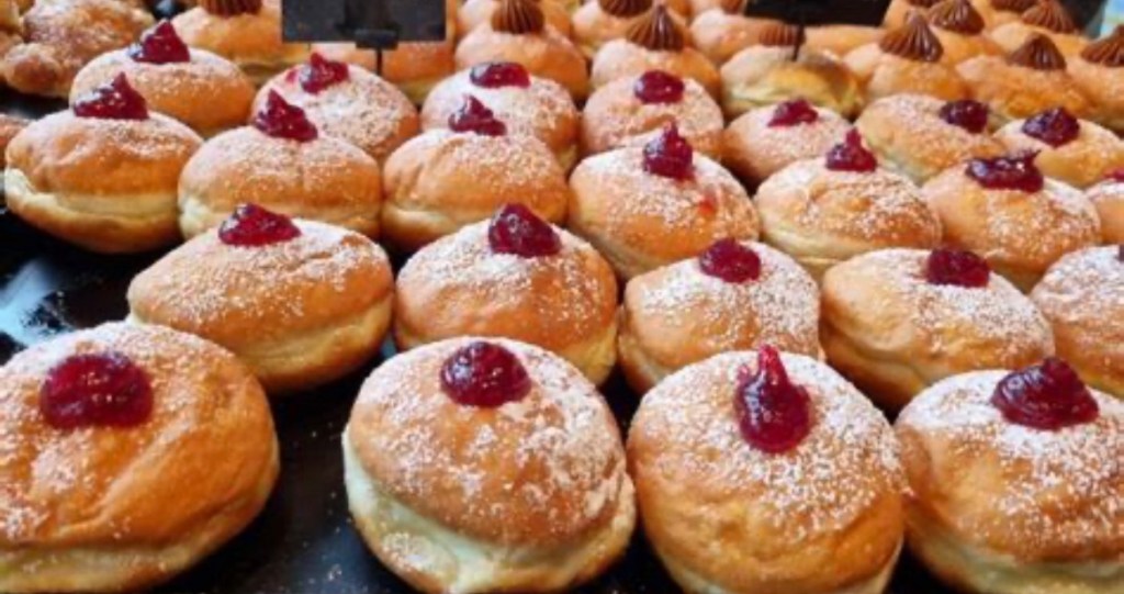The night in Yerushalayim get really chilly in winter, so there were stands with hot sangria, sachlav, a Middle Eastern favorite drink. It’s rich and hot and made from orchid tubers, creamy with coconut, pistachios and cinnamon sprinkled on top. Pure heaven. Hot roasted chestnuts, hot cider and hot chocolate… and of course jelly filled doughnuts, called sufganiot.
